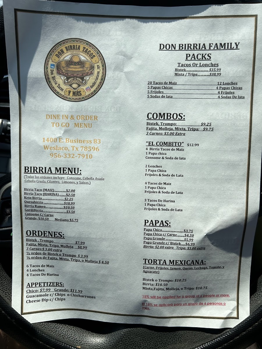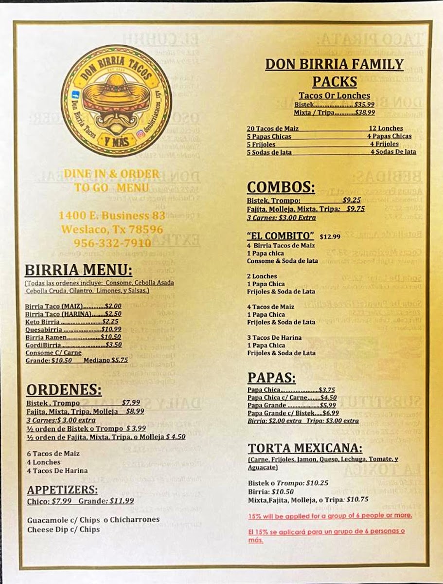 Welcome to Don Birria Tacos y Mas, LLC, a culinary gem nestled in Weslaco, Texas. Located at 1400 Business Hwy 83 E, this vibrant eatery specializes in authentic Mexican fare, primarily featuring mouthwatering birria tacos and an array of other delicious offerings. With a phone number of +1 956-332-7910, Don Birria Tacos y Mas is not just a place to eat; it’s a destination for food enthusiasts in search of robust flavors and a warm atmosphere.